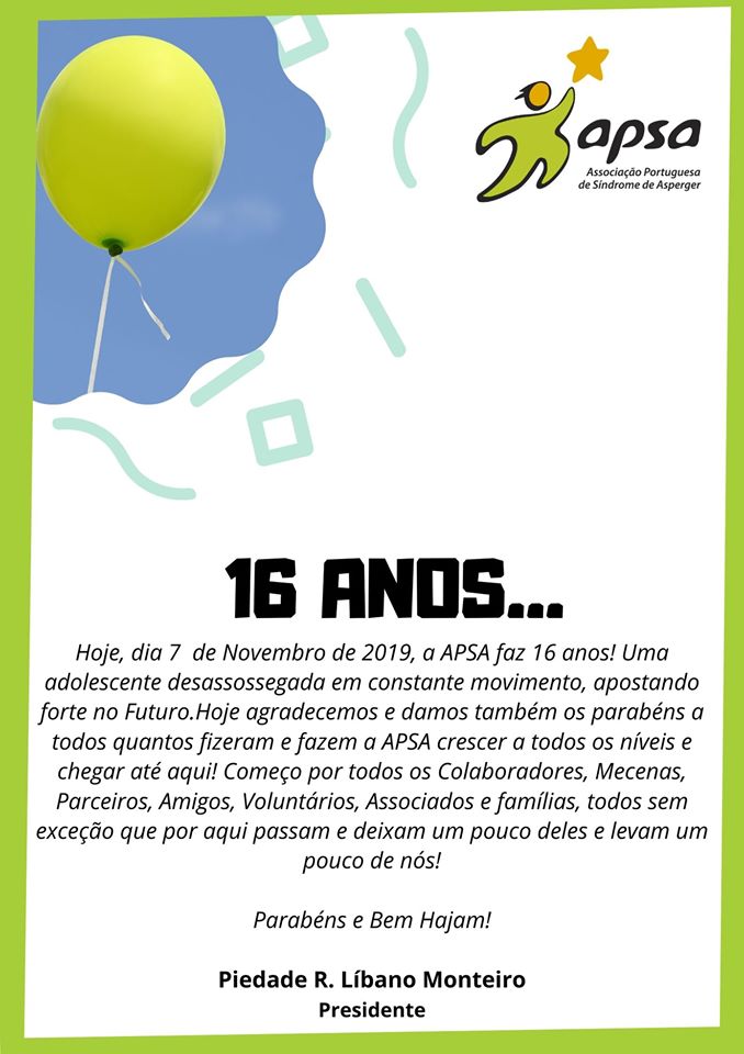 No dia 7 de novembro a APSA completou 16 anos. Cantámos todos os parabéns na cantina, com direito a bolo de aniversário. A nossa presidente, Piedade Líbano Monteiro, escreveu uma mensagem que divulgámos nas nossas redes sociais.
