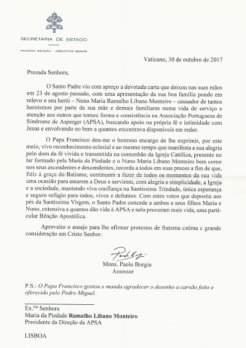 O Papa Francisco respondeu cordialmente à carta de intenções deixada pela Presidente da APSA, Piedade Líbano Monteiro, aquando da sua visita em Agosto deste ano. O Santo Padre abençoou condignamente a APSA , a sua presidente , e toda a sua família pela dedicação e esforço pela causa. Um obrigado imenso a tamanho reconhecimento por parte do Papa Francisco. Bem haja!